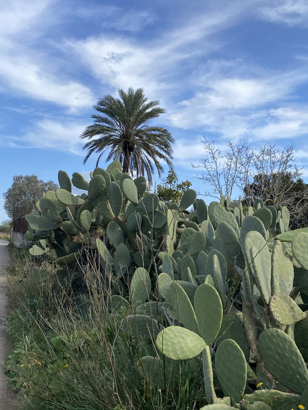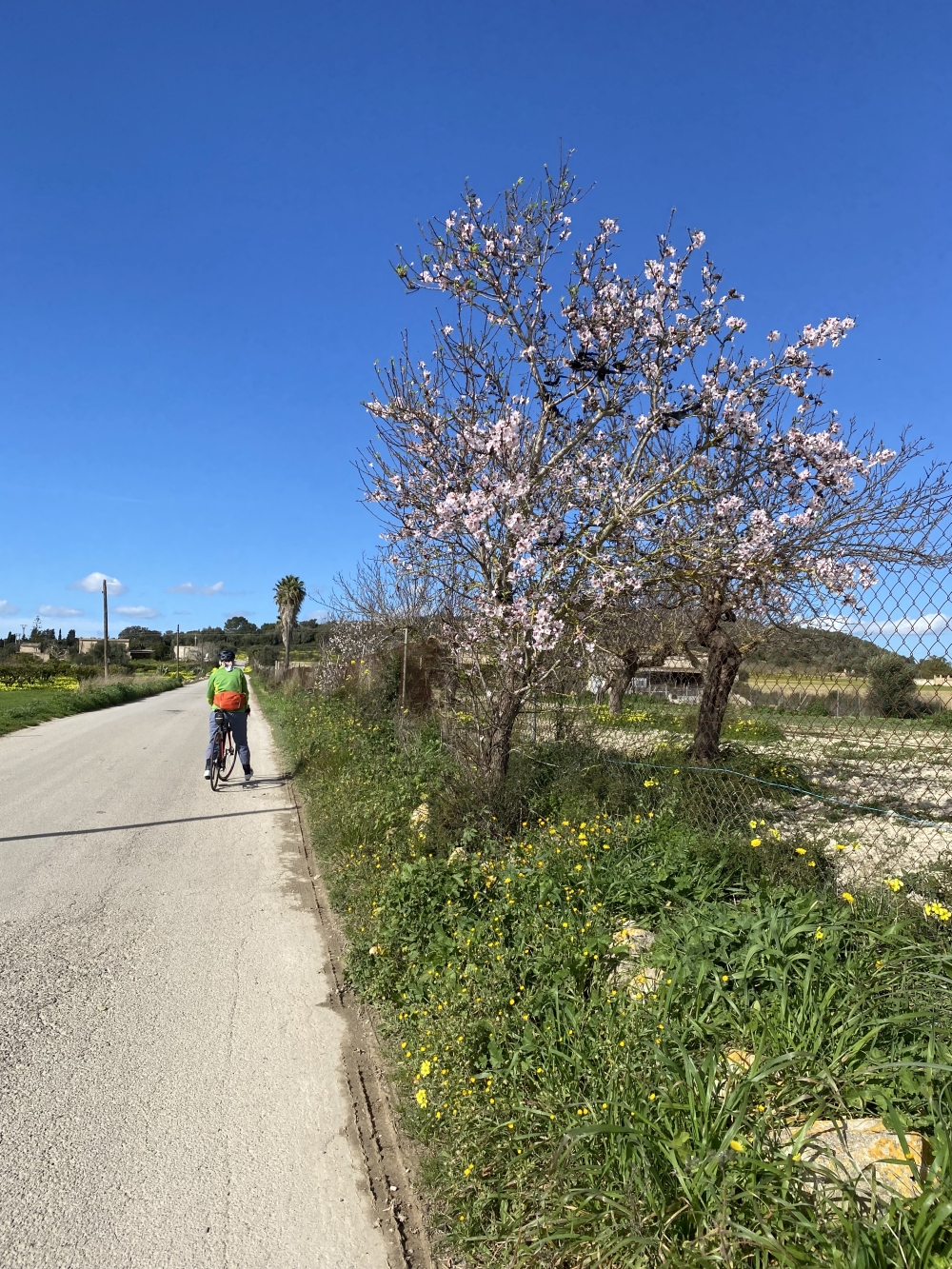 Irgendwie habe ich mir `ne Atemwegserkrankung eingefangen, mir geht`s foglich schlecht (Antriebslos, Gliederschmerzen, Husten). Andererseits ist die Wetterprognose gar nicht so schlecht. Also doch rauf auf die Räder und noch mal die Runde von vorgestern. Und doch war die Tour komplett anders, denn es gab heftigen Wind aus Westen. Erst in Santa Maria del Cami, unserem Zwischenstopp, wurden wir erlöst, denn jetzt hatten wir auf dem Weg nach Hause `ne durchaus willkommene Unterstützung.