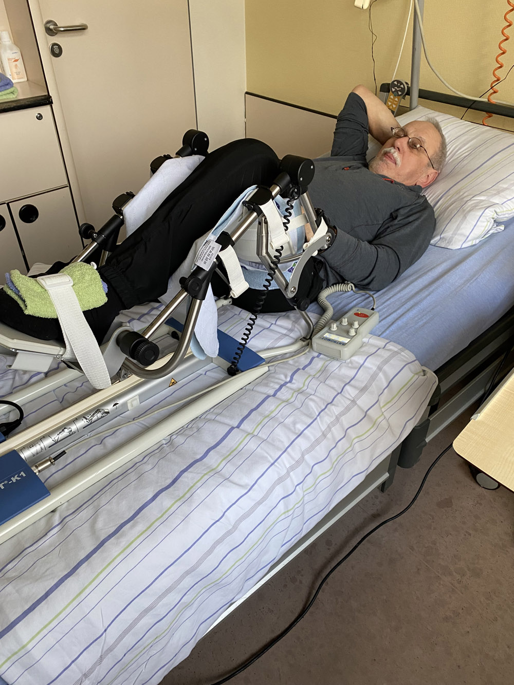 Doch der Reihe nach: Angefangen hat alles damit, dass wir im November 2024 schweren Hezens längst gebuchte Flugtickets für einen geplanten, mehrmonatigen Aufenthalt in Südamerike (Patagonien) stornieren mussen, weil Arnos Schmezen im linken Knie nicht mehr auszuhalten waren und der Orthopäde seines Vertrauens zu einem neuen Kniegelenk (TEP) riet. Also ab ins Bethel-Krankenhaus und am 06. März 2025 die Knie-OP.