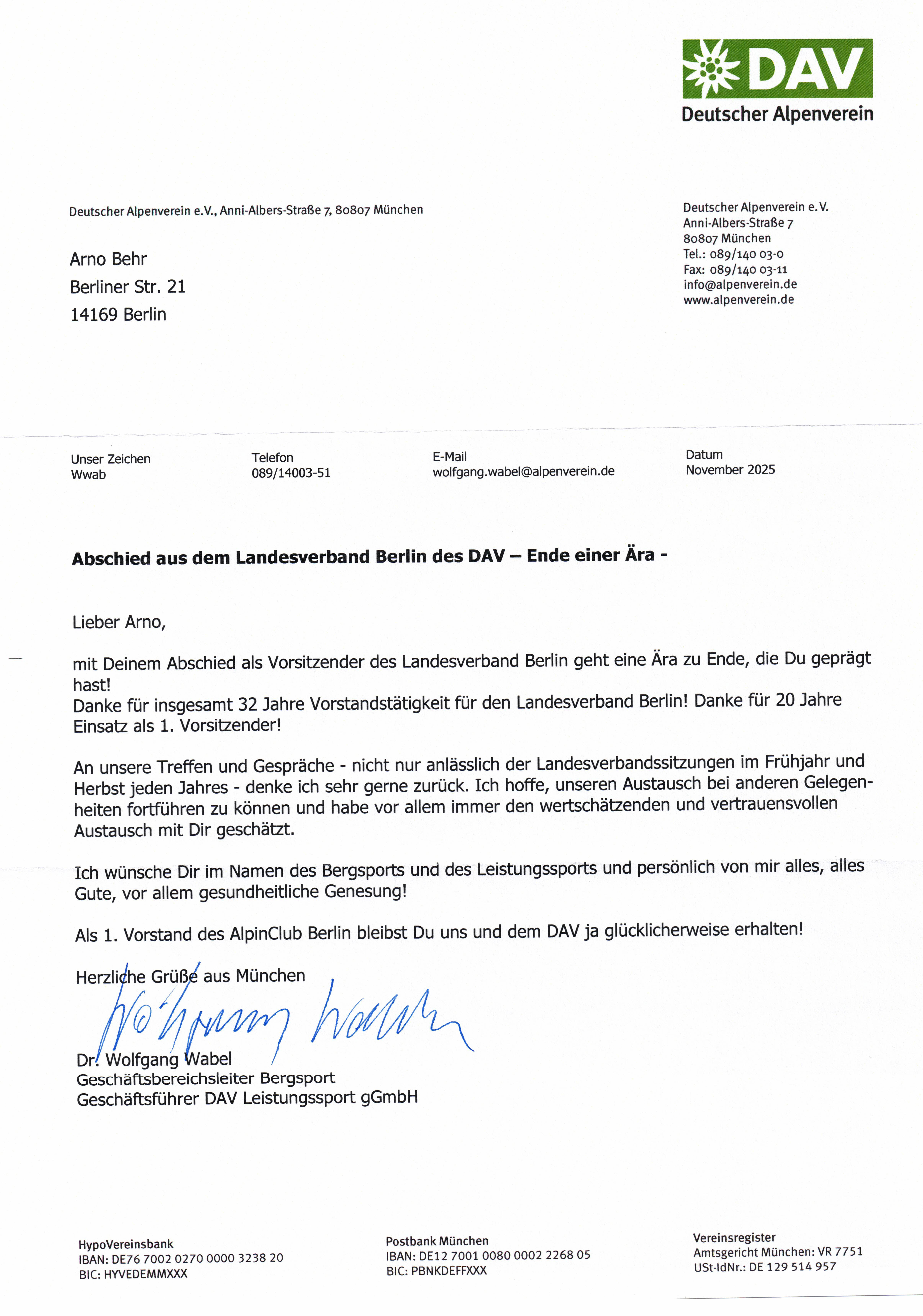 Der Landesverband Berlin des Deutschen Alpenvereins (LV Berlin des DAV) ist 1993 in den Geschäftsräumen der Sekt. Charlottenburg (heuet AlpinClub Berlin) gegründet worden. Zuvor hatte es im Vorfeld der Gründung bereits jede Menge Orientierungs- und Abstimmungsrunden (LSB, DAV, etc.) gegeben, an denen ich aktiv teilnahm, ehe sich schließlich die Sektion Berlin und der AlpinClub Berlin - unter Beteiligung von fünf weiteren natürlichen Personen - zum Verein zusammen schlossen, sich eine Satzung gaben und die Eintragung ins Vereinsregister, die Anerkennung der Förderungswürdigkeit, sowie der Gemeinnützigkeit, etc. beantragten. - Später, konkret am 18. April 2001, wurde auch die Sekt. Alexander v. Humboldt Mitglied im LV Berlin des DAV. Der vierte Berliner Alpenverein, die Sektion Brandenburger Tor, ist hingegen an einer Mitgliedschaft nicht interessiert.