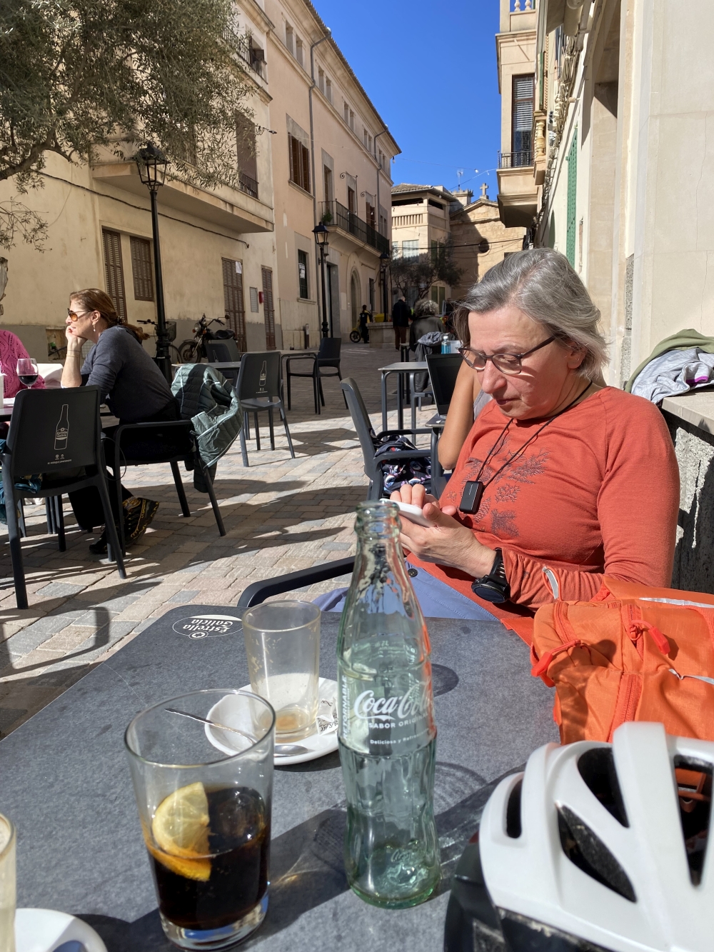 Und tatsächlich, es regnet erst einmal nicht mehr. Also machen wir uns fertig für die erste Rennrad-Tour in diesem Jahr. Für Arno ist es sogar die erste Tour nach ca. sieben Monaten!. Und ja, ein wenig mulmig war ihm dabei schon. Wir fahren gut 55 km mit Einkehr in Santa Maria del Cami. Dann bei weiterhin gutem Wetter direkt wieder nach Hause zum Kaffee trinken und Duschen. Leider soll es aber morgen schon wieder regenen.