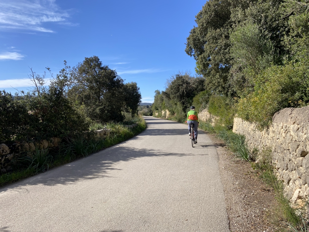 Irgendwie habe ich mir `ne Atemwegserkrankung eingefangen, mir geht`s foglich schlecht (Antriebslos, Gliederschmerzen, Husten). Andererseits ist die Wetterprognose gar nicht so schlecht. Also doch rauf auf die Räder und noch mal die Runde von vorgestern. Und doch war die Tour komplett anders, denn es gab heftigen Wind aus Westen. Erst in Santa Maria del Cami, unserem Zwischenstopp, wurden wir erlöst, denn jetzt hatten wir auf dem Weg nach Hause `ne durchaus willkommene Unterstützung.