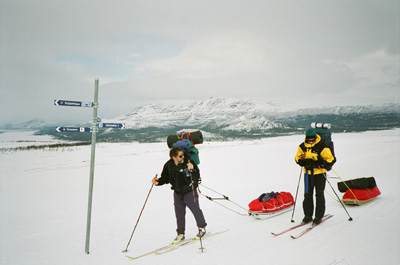 Wir (Brigitte und ich) entschlossen uns zu letzterer Variante. Wieder suchten und fanden wir kompetente Hilfe und Unterstützung bei der Familie Gruda. Allerdings wurde uns auch rasch bewusst, dass eine Sarek-Durchquerung mit Zelt und Pulka doch einige Risiken mehr barg, als eine reine Hüttentour. Die gewollte Einsamkeit hat zumindest in Gefahrensituationen auch ihren Preis. Da es hier weder Mensch noch Telefon gibt (auch das Handy funktioniert nicht), darf einem eigentlich nichts ernsthaftes passieren, da man sonst den verletzten Partner allein zurück lassen muss, um in einer Mehrtagestour Hilfe zu holen. - Folglich beschlossen wir, gleichgesinnten Mitreisende zu suchen, was leichter gesagt, als getan ist.