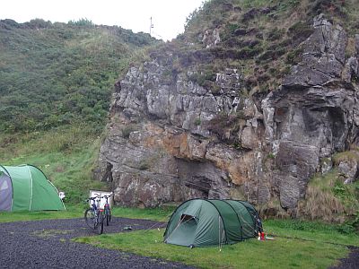 Wir ziehen die Regenhosen an und räumen das Feld. Vor uns liegt eine der schwierigsten Etappen unserer Tour. Sehr sehr steile Anstiege wechseln sich ab mit rasanten Abfahrten und engen Kurven. Zum Glück dürfen die Wohnmobilheinis hier nicht lang. Nach etwa 20 km und 550 Höhenmeter sind wir auf der anderen Seite wieder unten und belohnen uns in Cushendun mit einem zweiten Frühstück. – Sollen wir jetzt nach dieser Schwerarbeit den nächsten Zeltplatz ansteuern oder weiterfahren. Da jetzt ab und an die Sonne ein Gastspiel gibt, beschließen wir die nun folgende Flachetappe noch mitzunehmen und erreichen schließlich kurz vor Larne einen schön gelegenen Zeltplatz, der leider aber eigentlich ausgebucht sein soll. – Ich muss schon ganz schön k.o... Ausgesehen haben, denn plötzlich erbarmte sich die Einlasschefin meiner und gestattete uns, doch hier unser Zelt aufzuschlagen. Immerhin war es der abschüssigste Platz unserer bisherigen Tour.